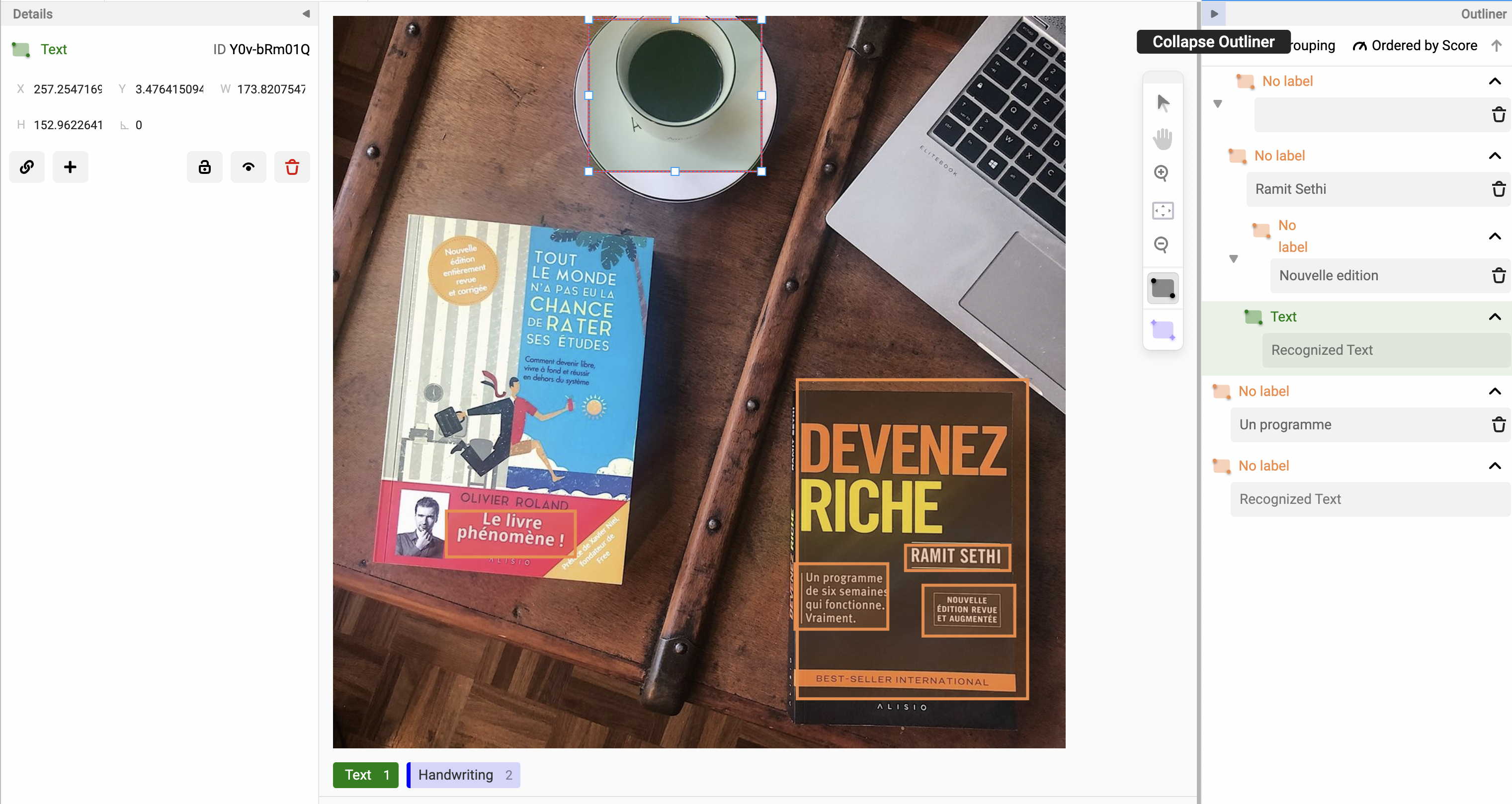 The Outliner is a replacement for the existing interface with a multiple-panel approach. This feature improves the user experience to fit more data in these two columns (Outliner and Details) and provides more options when working with regions. For example, Image segmentation is the only type of labeling that supports custom controls on the details panel.