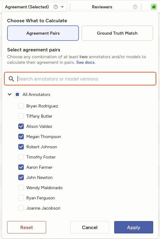 You can select a subset of annotators to compare. This is different and more precise than the Agreement column which automatically includes all annotators in the score.