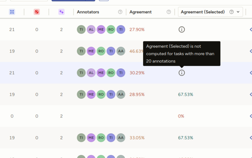 We currently only support calculating the Agreement (Selected) columen for tasks with 20 or less annotations. If you have a task with more than this threshold, you will see an info icon with a tooltip.